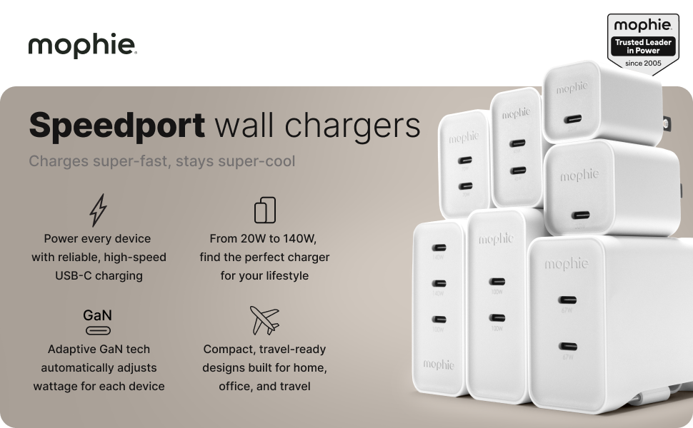 Big power, sleek design—that’s the Speedport 140W Wall Charger. With three USB-C ports delivering up to 140W of shared fast-charging power, you can keep your laptop, tablet, and phone charged all at once. GaN technology makes it run cooler and more efficiently, while the compact design and folding prongs make it perfect for travel or everyday use.
